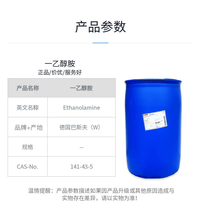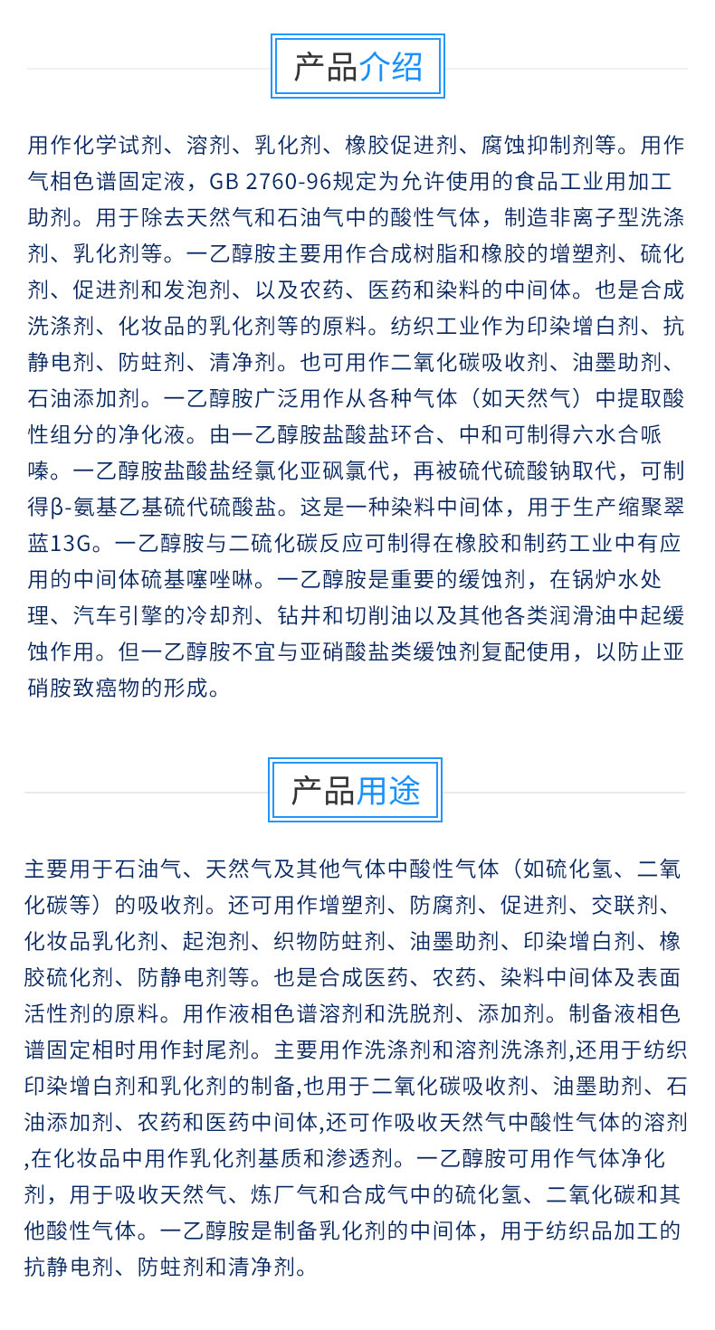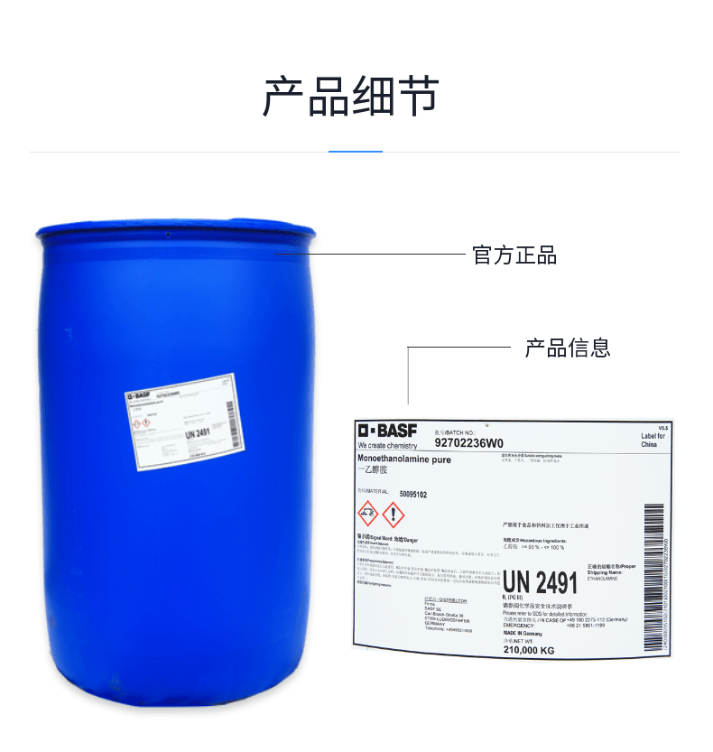 商品别名:MEA;MEOA;2-氨基乙醇;2-羟基乙胺;乙醇胺;单乙醇胺