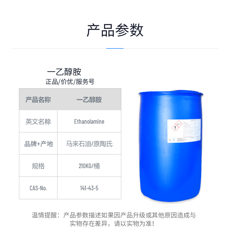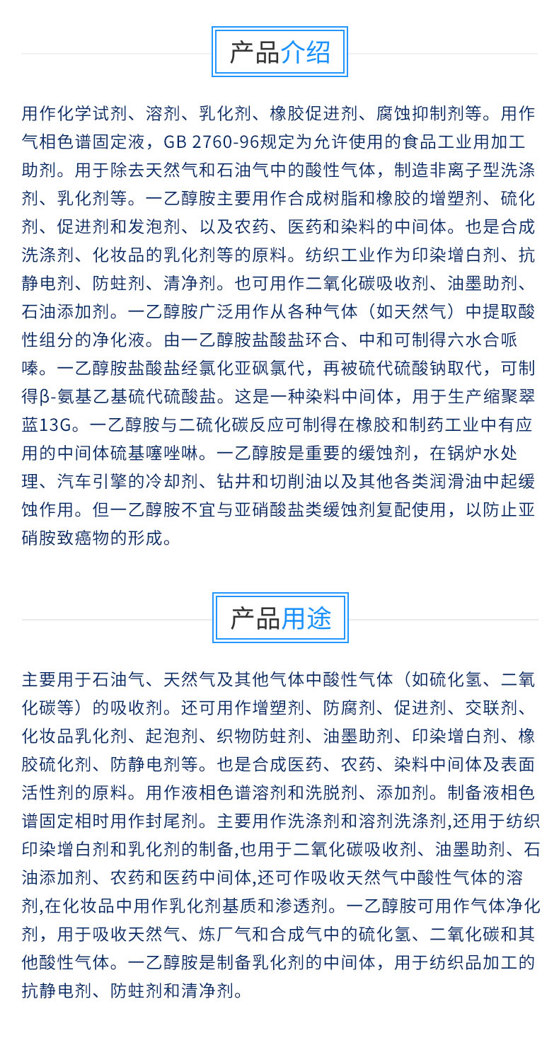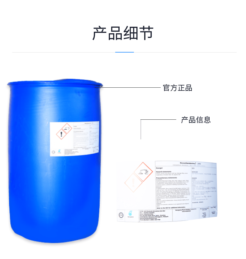 商品别名:MEA;MEOA;2-氨基乙醇;2-羟基乙胺;乙醇胺;单乙醇胺