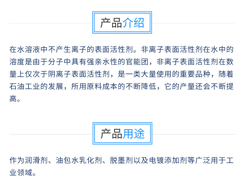 在水溶液中不产生离子的表面活性剂。非离子表面活性剂在水中的溶度是由于分子中具有强亲水性的官能团,非离子表面活性剂在数量上仅次于阴离子表面活性剂,是一类大量使用的重要品种,随着石油工业的发展,所用原料成本的不断降低,它的产量还会不断提高。